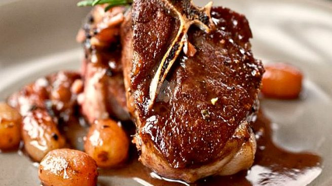 Chuletas de cordero a la plancha con aceitunas verdes y salsa confitada de miel y naranja