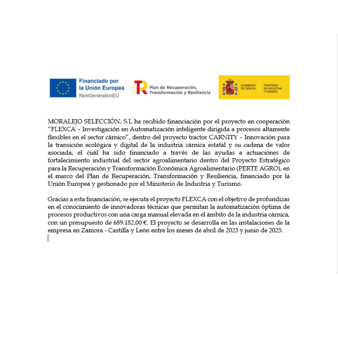 MORALEJO SELECCIÓN, S.L ha recibido financiación por el proyecto en cooperación “FLEXCA – Investigación en Automatización inteligente dirigida a procesos altamente flexibles en el sector cárnico”, dentro del proyecto tractor CARNITY – Innovación para la transición ecológica y digital de la industria cárnica estatal y su cadena de valor asociada, el cuál ha sido financiado a través de las ayudas a actuaciones de fortalecimiento industrial del sector agroalimentario dentro del Proyecto Estratégico para la Recuperación y Transformación Económica Agroalimentario (PERTE AGRO), en el marco del Plan de Recuperación, Transformación y Resiliencia, financiado por la Unión Europea y gestionado por el Ministerio de Industria y Turismo.