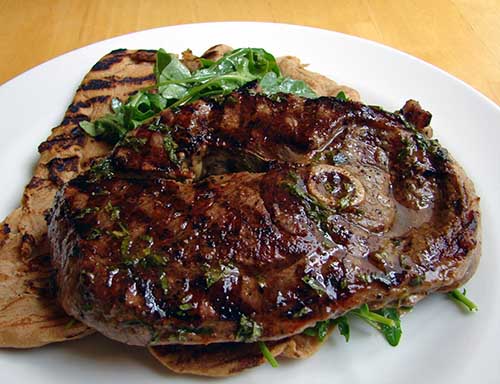 Chuletas de cordero a la plancha con aceitunas verdes y salsa confitada de miel y naranja