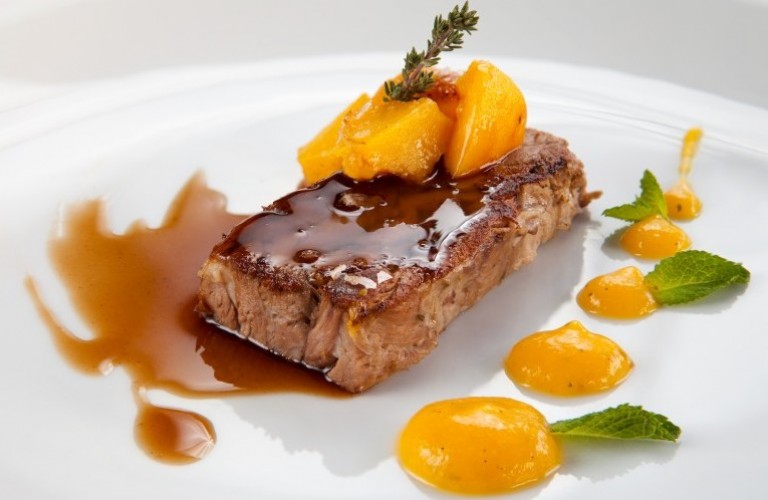 Cordero con melocotón asado y pimiento amarillo con menta