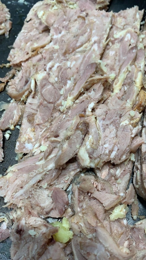 - Carne de cordero desmigada y compactada.