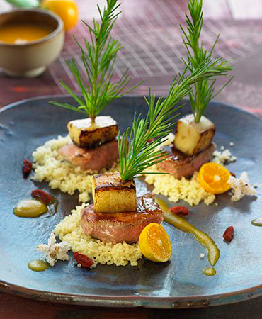 Platos Principales Brocheta de cordero con manzana y flores de azahar