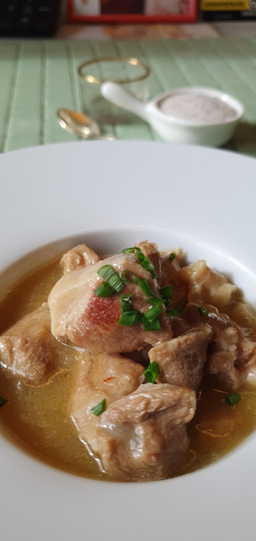Cortar la cebolla en tacos pequeños y rehogar. Seguidamente introducir el ajo cortadito en trozos pequeños. Salpimentar la carne y pasarla por maicena. Echar la carne en la cazuela y rehogarlo con el sofrito durante 2 minutos. Luego añadir vino blanco y agua hasta cubrir. Dejar cocer a fuego lento durante 1,5 horas.
