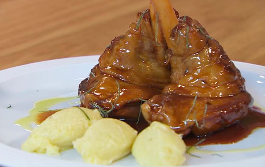 - Emplatar en un plato llano. Poner los codillos en el centro y el puré en porciones alrededor. Añadir un toque de aceite de oliva y salvia alrededor.