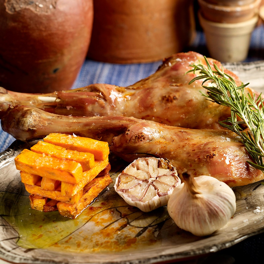 - Untar las paletillas con manteca. Sazonarlas con sal gorda, y colocarlas en cazuela de barro con la cabeza de ajo.